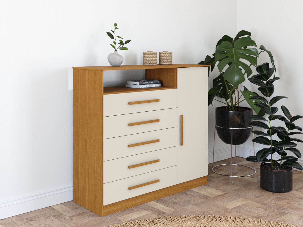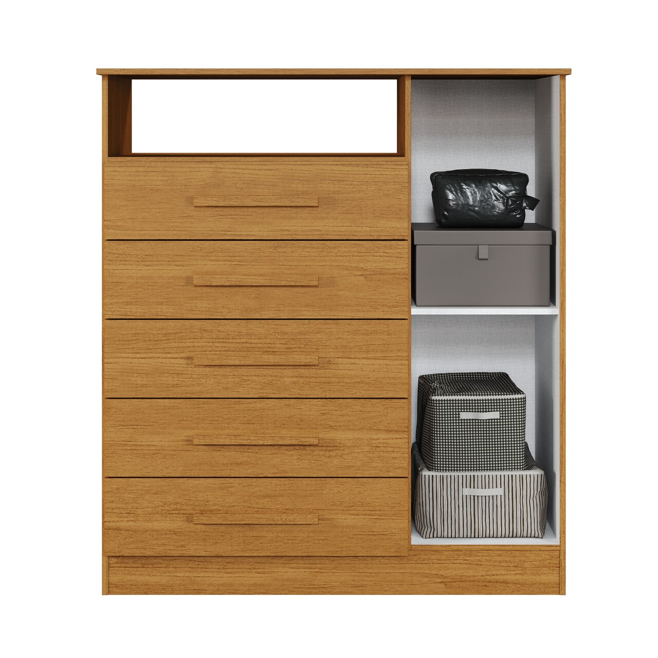 Cômoda com cinco gavetas externas e ao lado sapateira. Produzida em MDF de 12mm (Estrutura), 15mm (Frente de gaveta, Porta e Tampo) e fundo em MDF de 2,5mm.