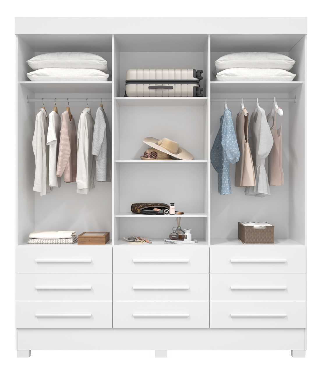 Pintura interna normal. Corrediças telescópica e Cabideiro em alumínio. Espelhos e Pés inclusos