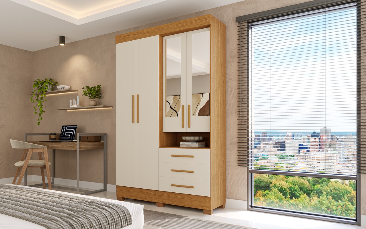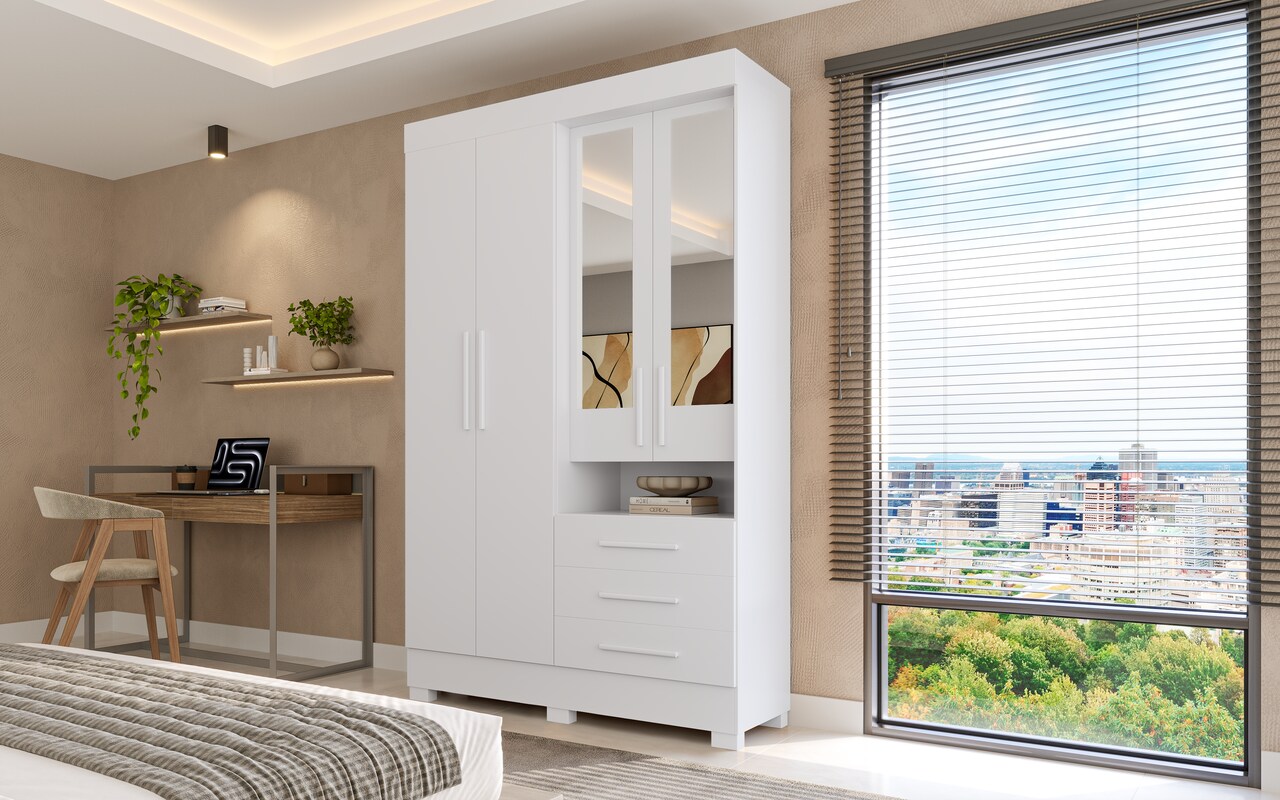 Roupeiro com 04 portas e 03 gavetas externas, 02 portas centrais recuadas com espelhos.