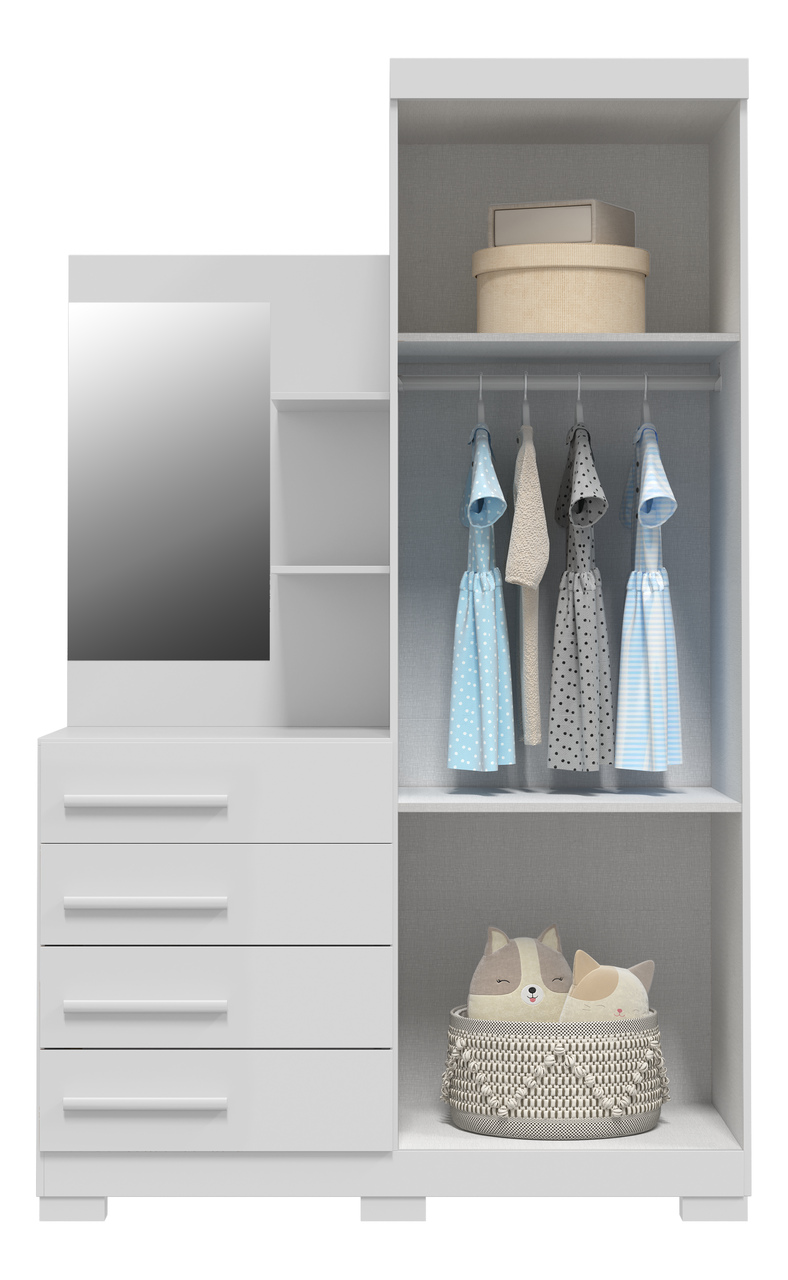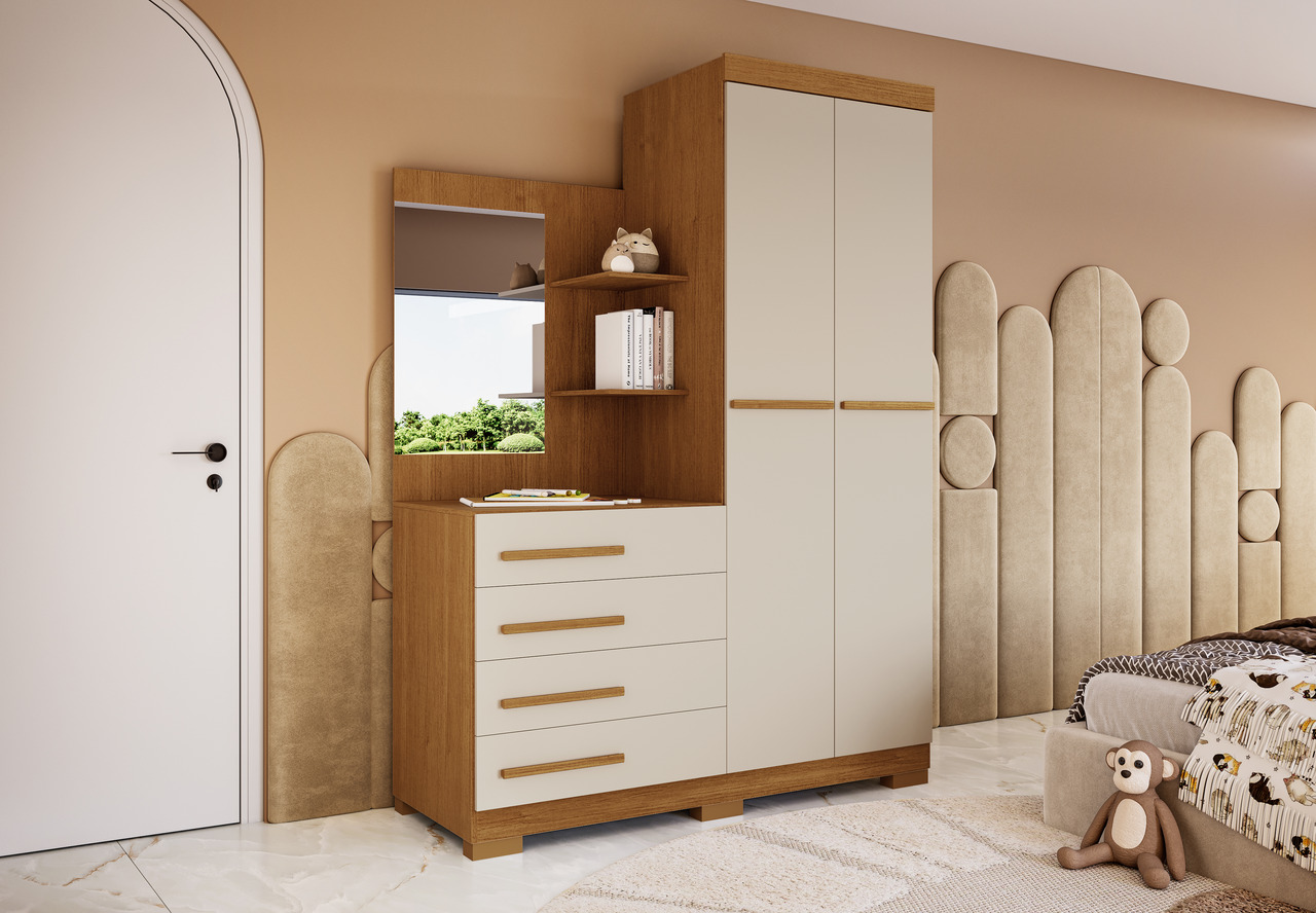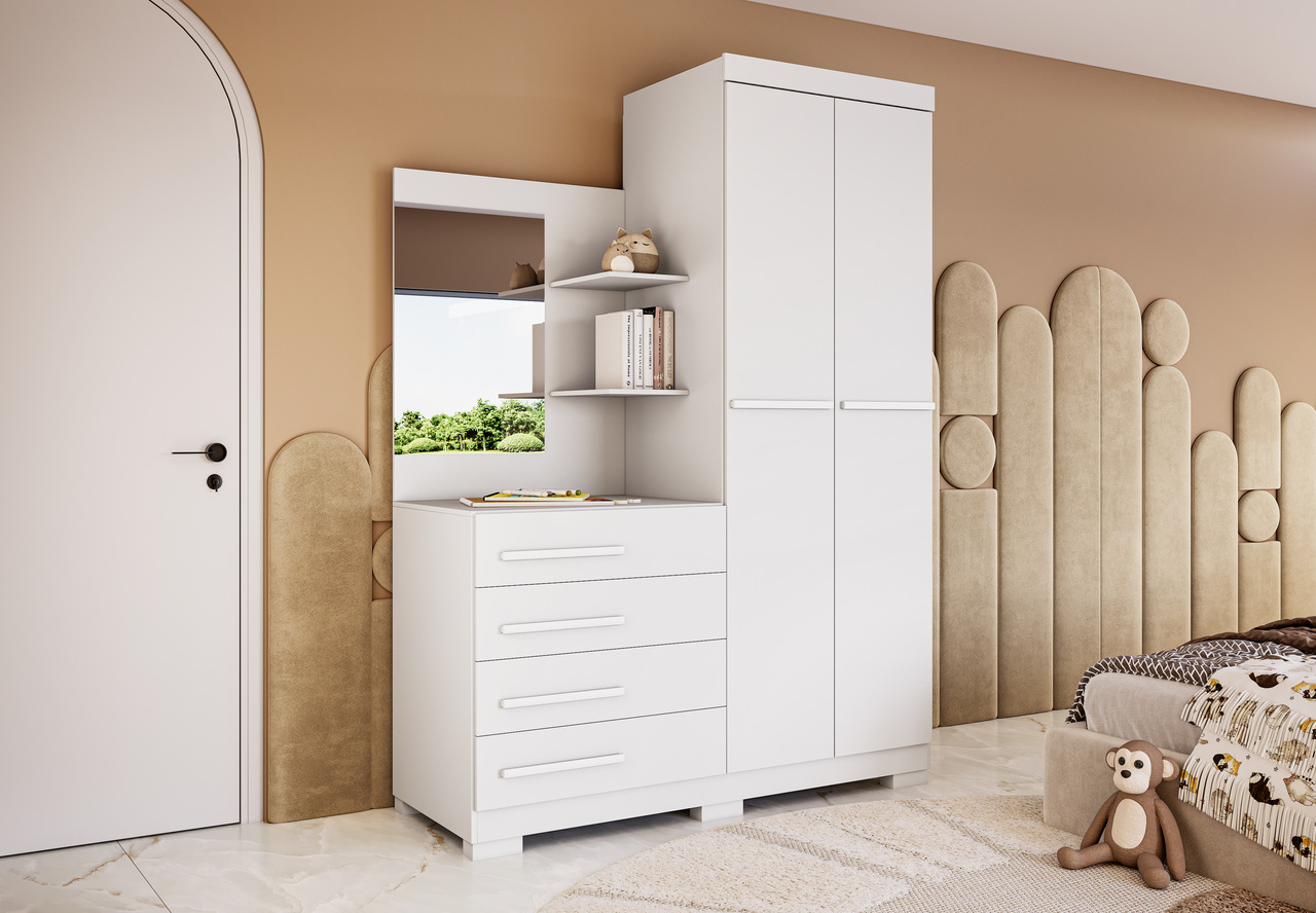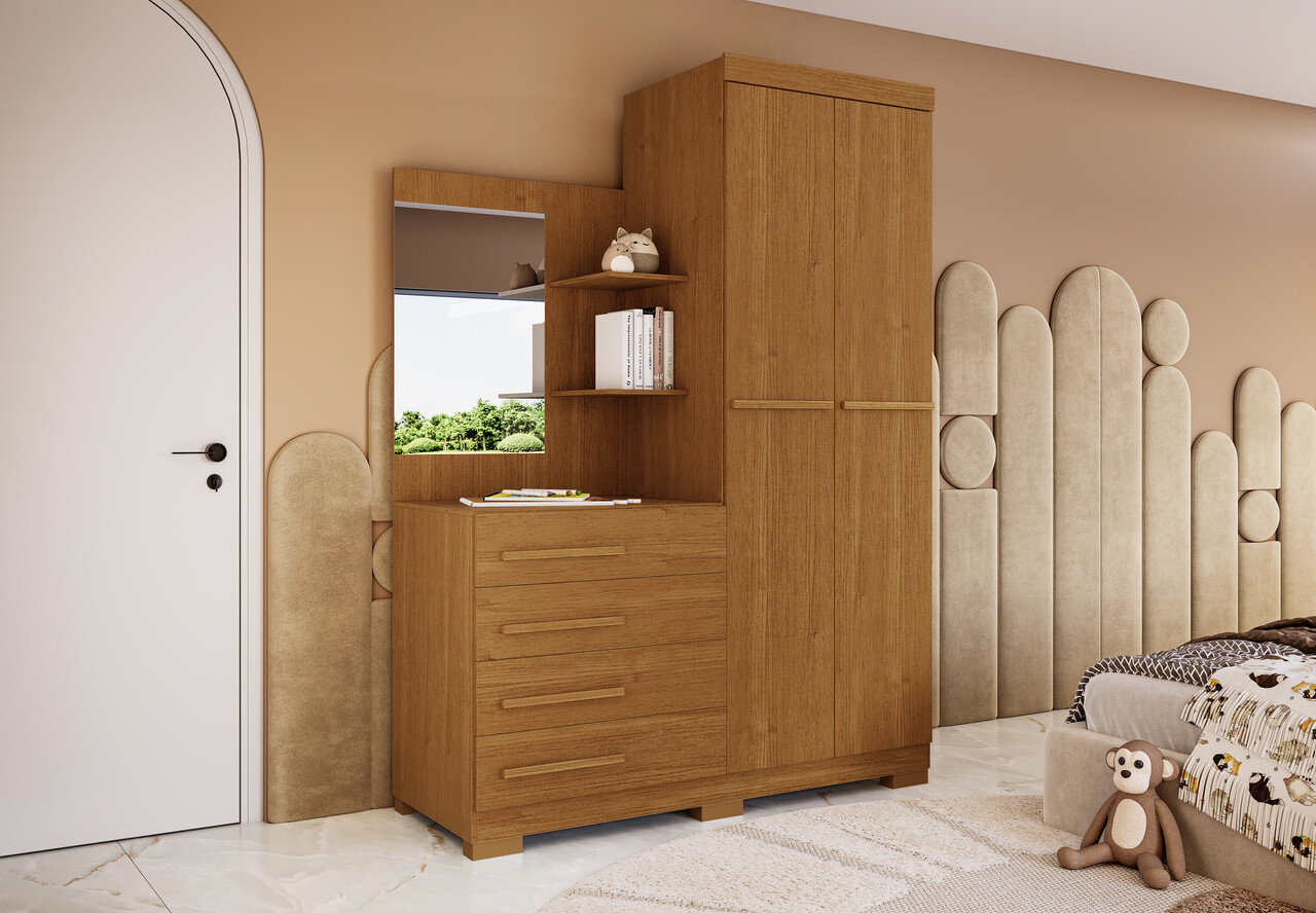 Roupeiro com 02 portas e cômoda ao lado com quatro gavetas externas e espelho.