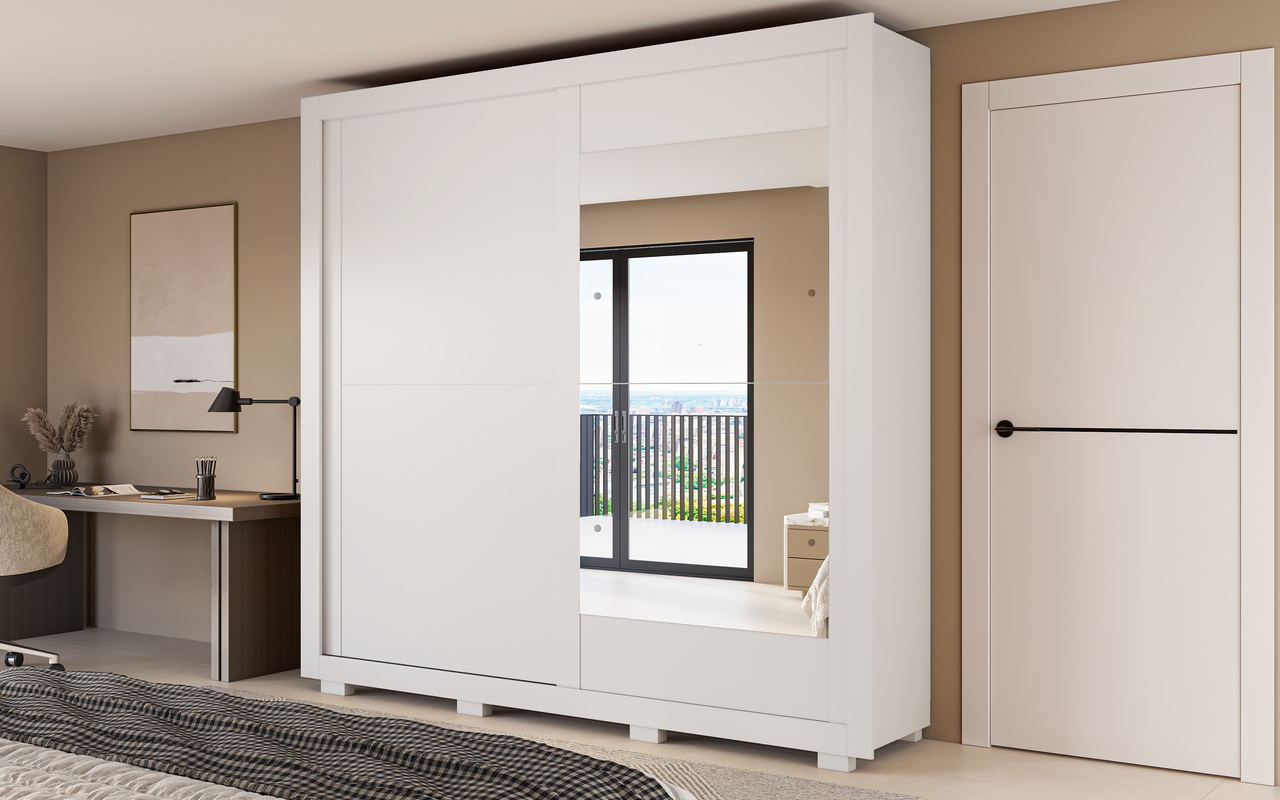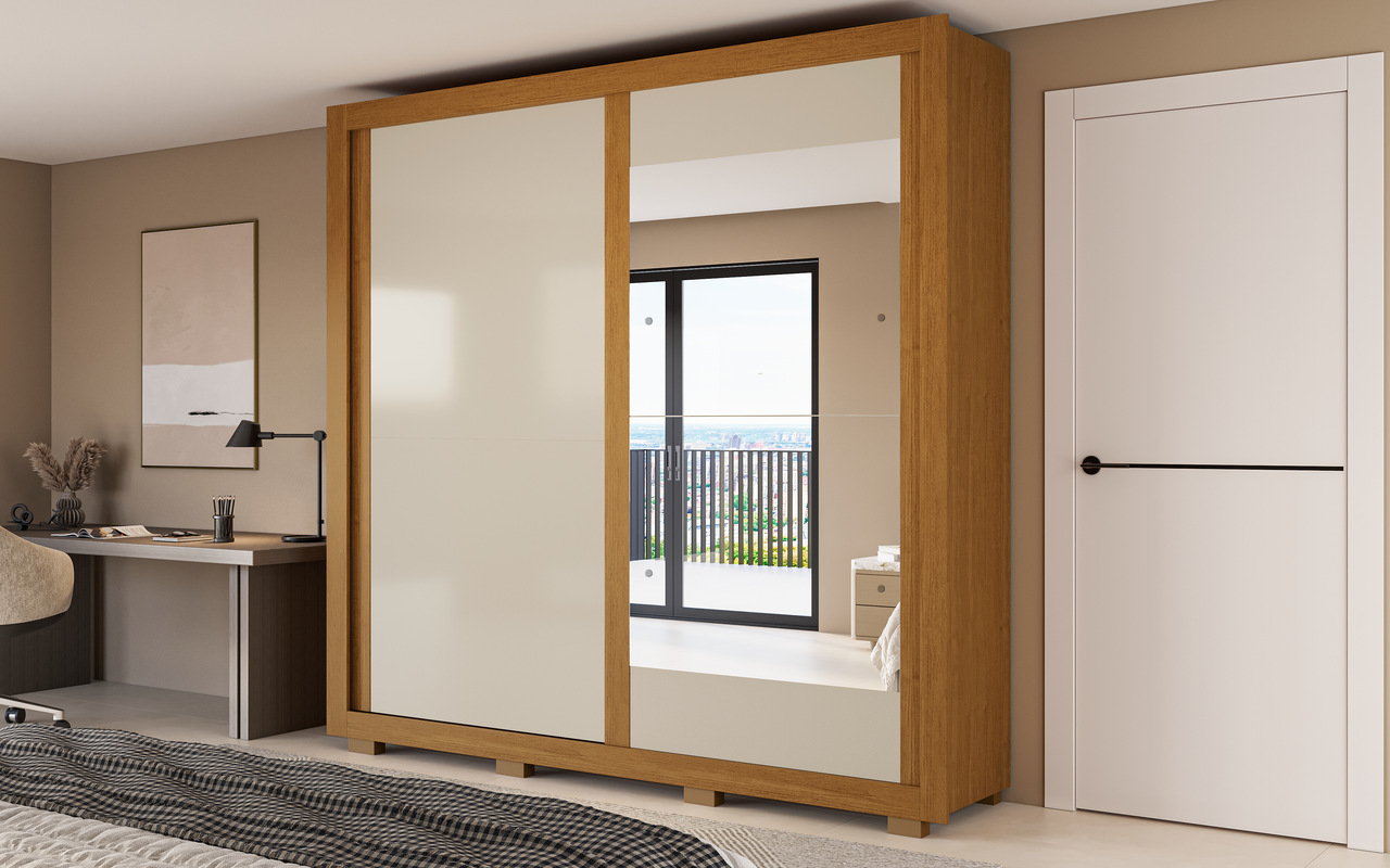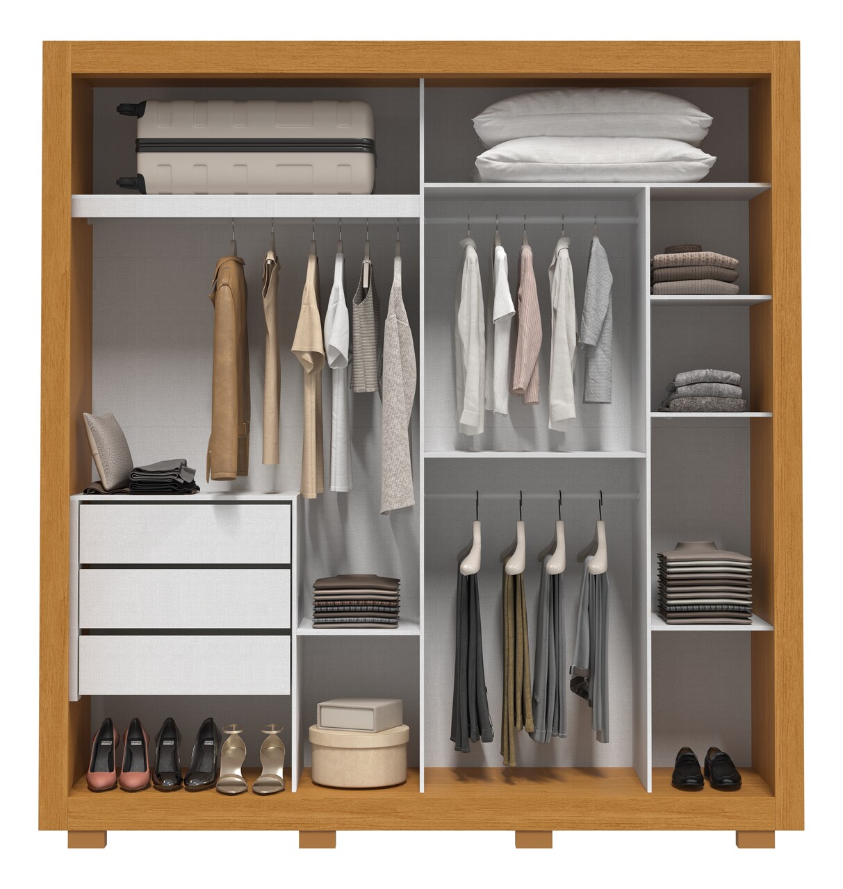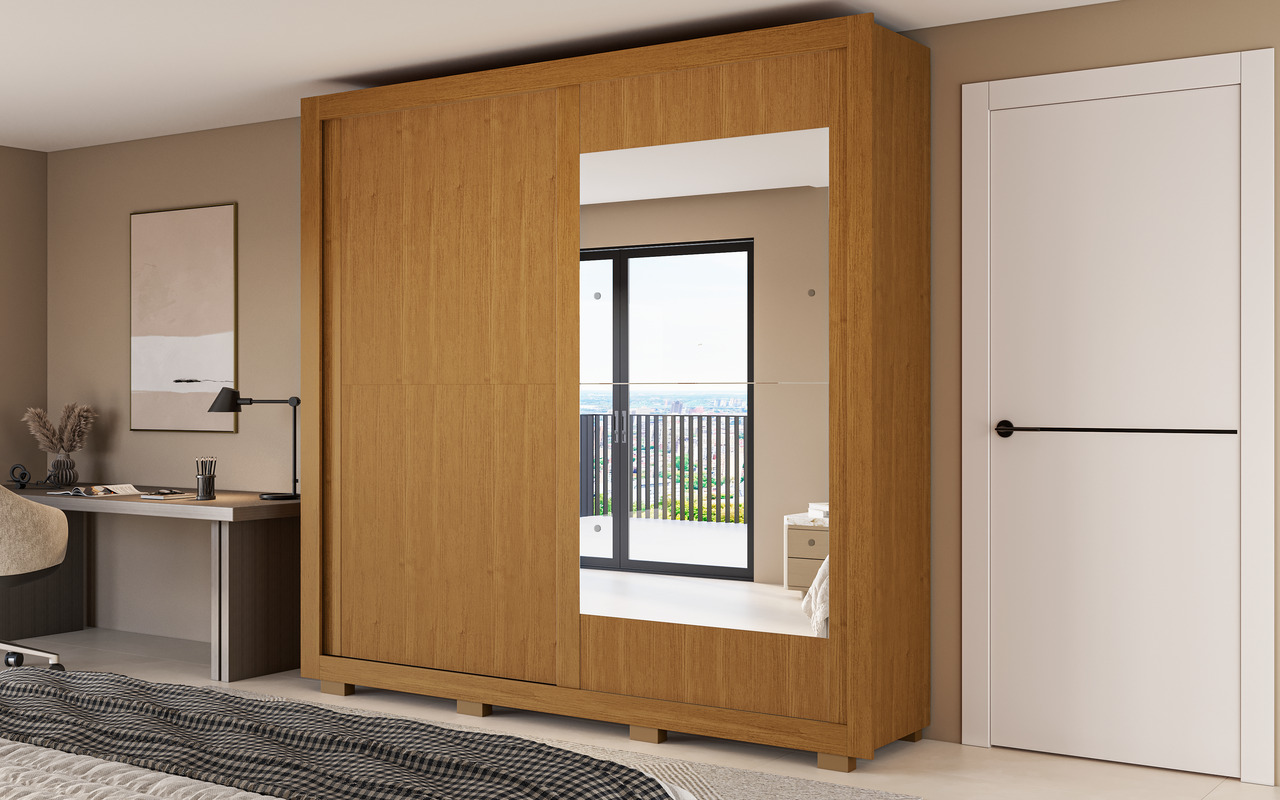 Roupeiro com 02 portas deslizantes, sendo 1 com espelhos parafusados, 03 gavetas internas corrediças Telescópicas.